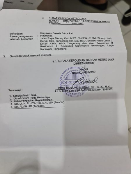 Jakarta – Setelah sebelumnya Advokat Alvin Lim membongkar pemerasan yang dilakukan oknum Fismondev Polda Metro Jaya serta melakukan perlawanan keras agar LP Mahkota Properti Indo Permata besutan Raja Sapta Oktohari hari di proses. Kini Kasubdit Renakta AKBP Pujiyarto, Polda Metro Jaya melaporkan Alvin Lim dengan tuduhan tindak pidana dengan sengaja di muka umum dengan lisan maupun tulisan menghina sesuatu kekuasaan yang ada di Negara Indonesia, menyiarkan berita bohong dan mencemarkan nama baik dengan LP A/506/VI/2022, tanggal 6 Juni 2022.