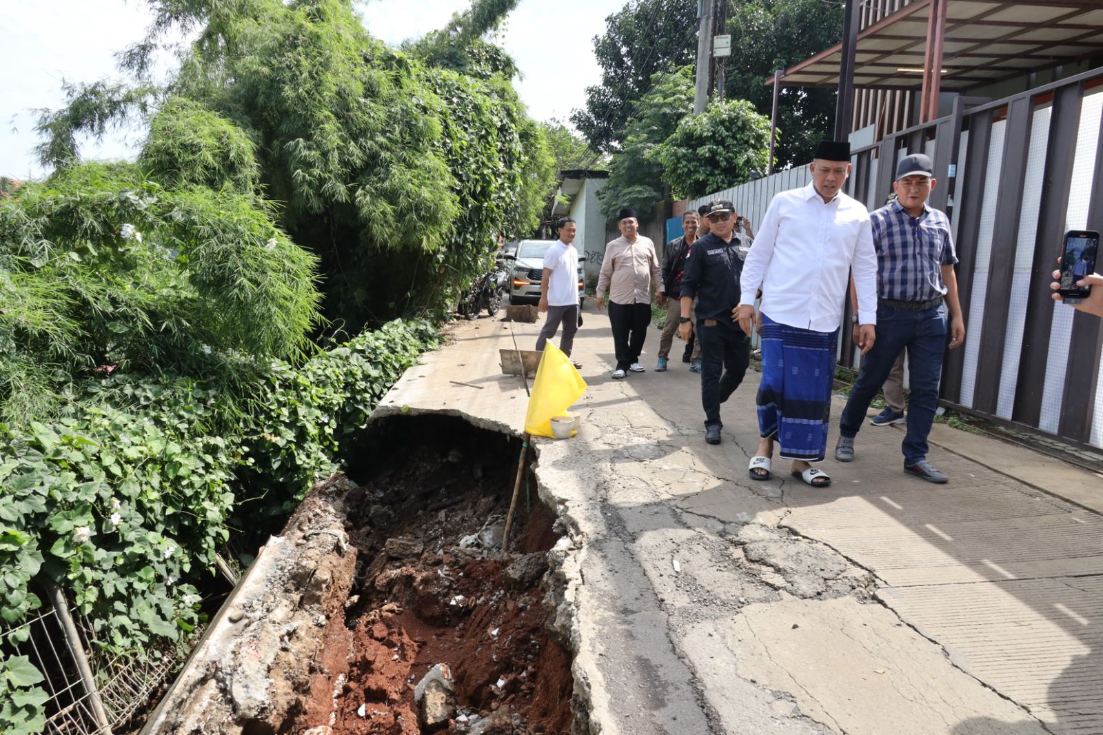 Bekasi — Wali Kota Bekasi, Tri Adhianto, meninjau langsung jalan longsor di RW 11, Kelurahan Jatiluhur, Kecamatan Jatiasih usai mengikuti kegiatan Lebaran Ketupat di Masjid Agung Al Barkah.