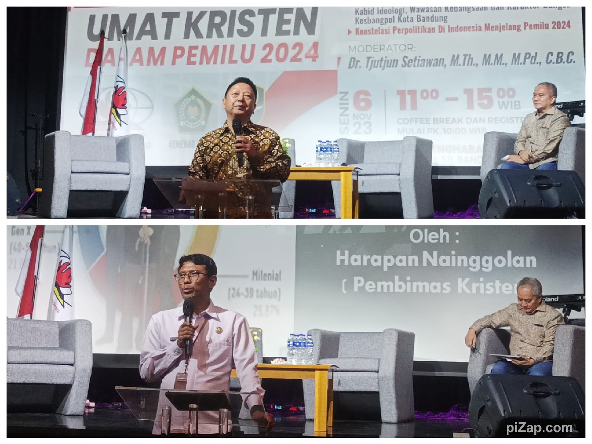 Selama acara, tiga pembicara membagikan wawasan mereka. Bpk. Aswin Sulaeman Utama Abdurrachman, S.E, A.K, M.Si, (Kabid Ideologi, Wawasan Kebangsaan, dan Karakter Bangsa, KESBANGPOL Kota Bandung), membahas “Konstelasi Perpolitikan di Indonesia Menjelang Pemilu 2024.” Pdt. Harapan Nainggolan, M.Min., M.Th., (Pembimas Kristen KEMENAG Jabar), membahas “Tantangan dan Peluang Milenial Kristen dalam Pemilu 2024.” Sementara itu, Pdt. Dr. Tonny Andrian Stefanus, M.Th., Ph.D. (Ketua DPC API Kota Bandung), mengupas “Kepemimpinan Pancasialis Dalam Perspektif Alkitab.”