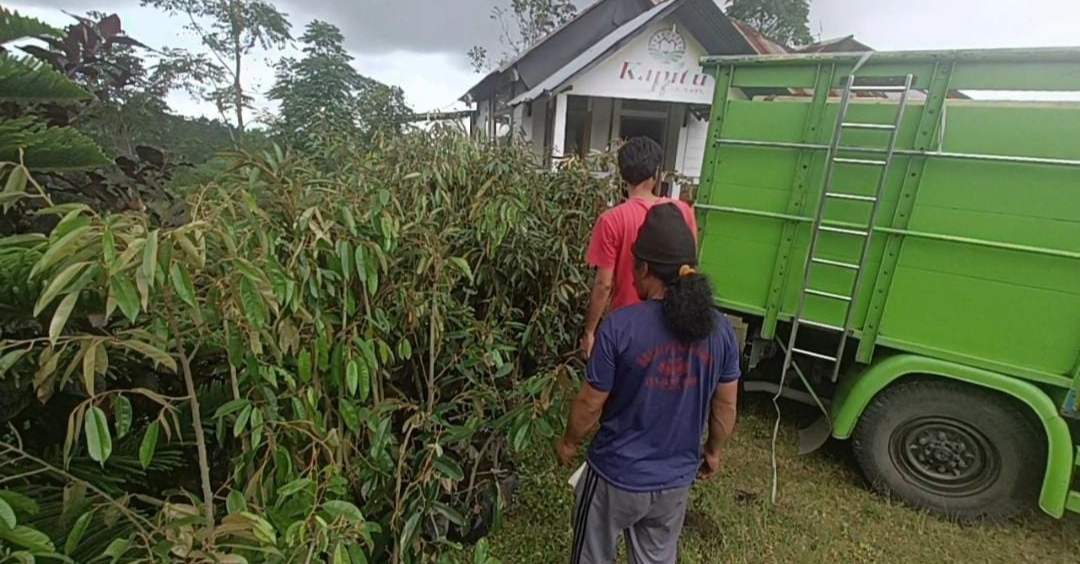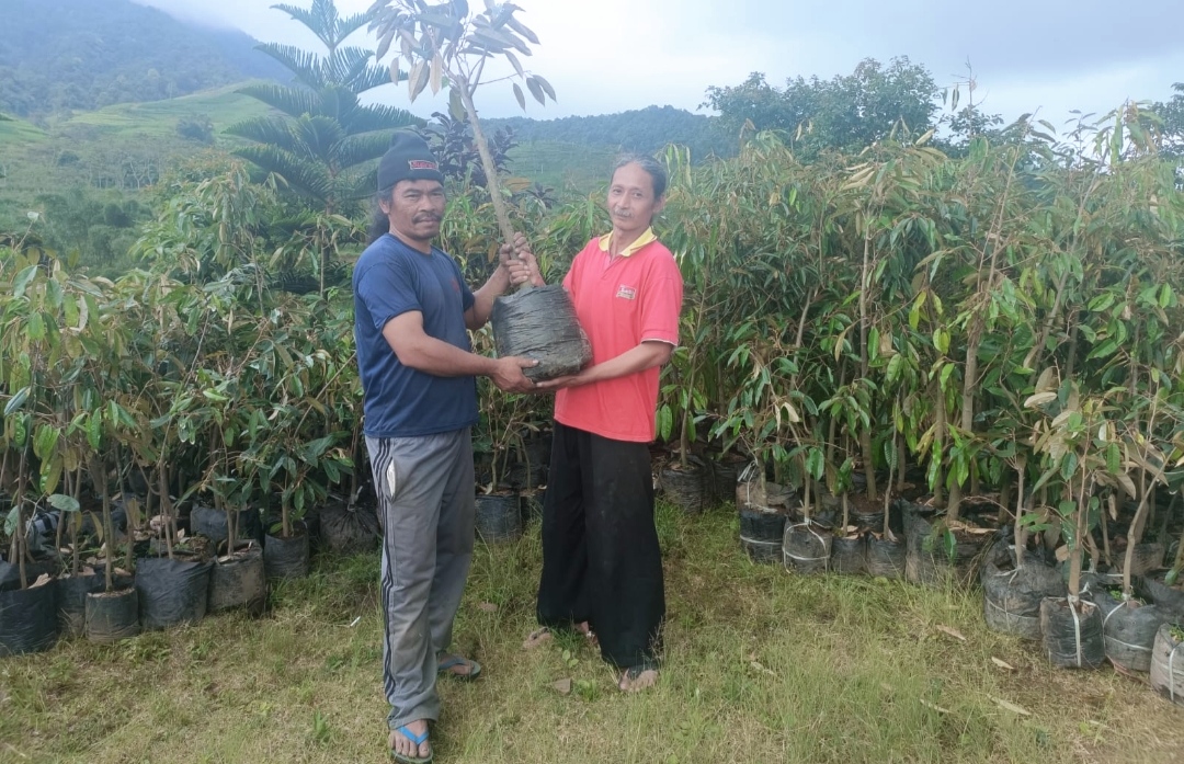 Drajat Nugroho Selaku Bidang Pertanian dan Pelestarian Alam, berikan Alat Pertanian dan Bibit Tanaman pada Waseno selaku Koordinator Cabang Barat Tugu Lawang Nusantara.