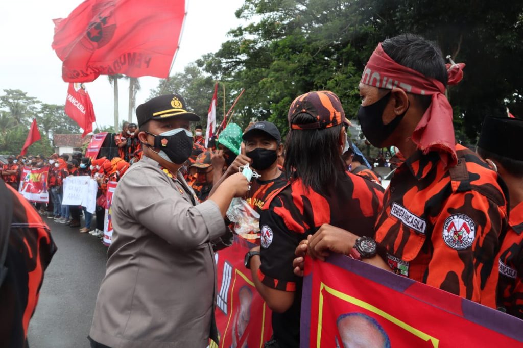 Selain mengamankan giat tersebut, Kapolres Lebak juga membagikan masker kepada para peserta aksi guna mencegah penyebaran covid-19.