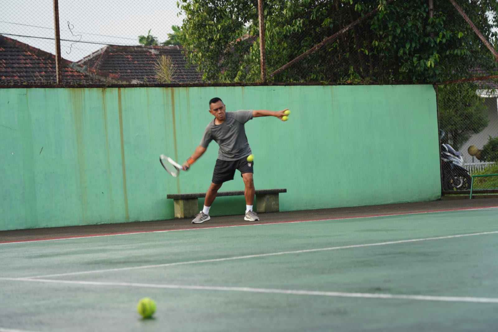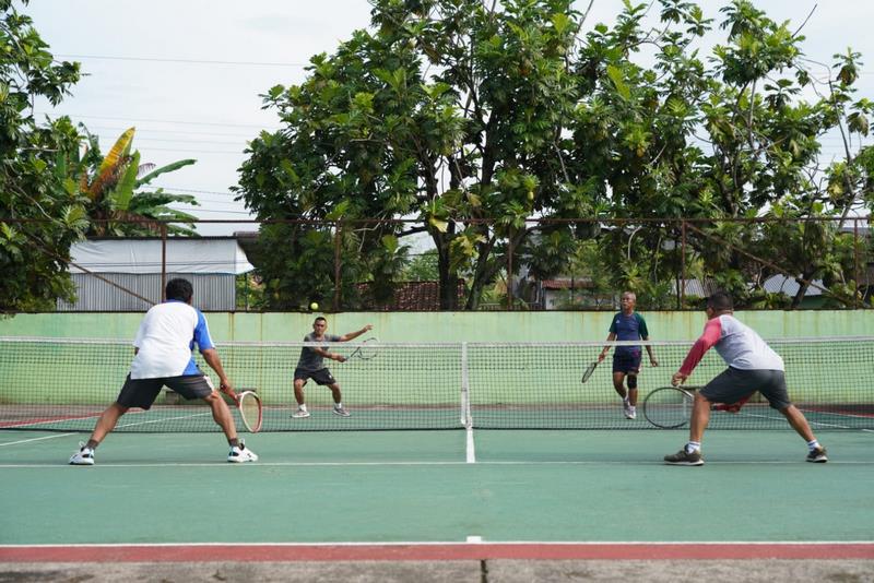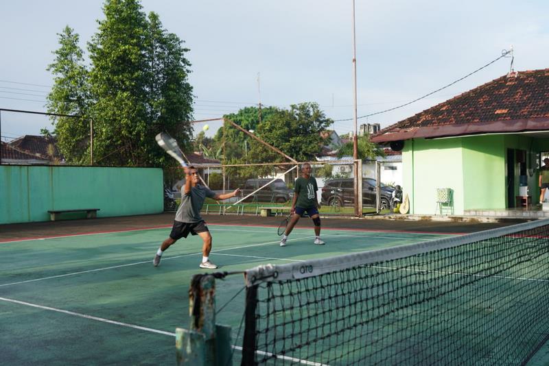 Yogyakarta – Kasrem 072/Pmk Kolonel Inf Heri Dwi Subagyo melaksanakan olahraga tenis Lapangan bersama Perwira Korem 072/Pamungkas dan perwakilan beberapa instansi sipil dalam upaya menjaga kebugaran dan kesehatan tubuh di masa Pandemi Covid-19 di Lapangan Tenis komplek perumahan Korem 072/Pamungkas Timoho, Yogyakarta, Jumat (21/1/2022).