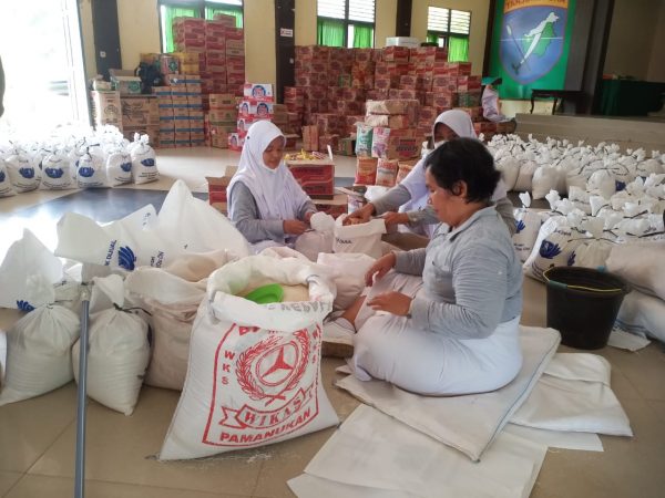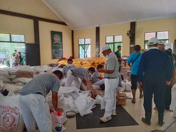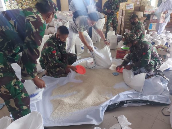 Para prajurit Kodim Sintang bersama para relawan saat ini bahu membahu mengemas bantuan dalam bentuk paket sembako, yang selanjutnya akan disalurkan kepada masyarakat yang membutuhkan.