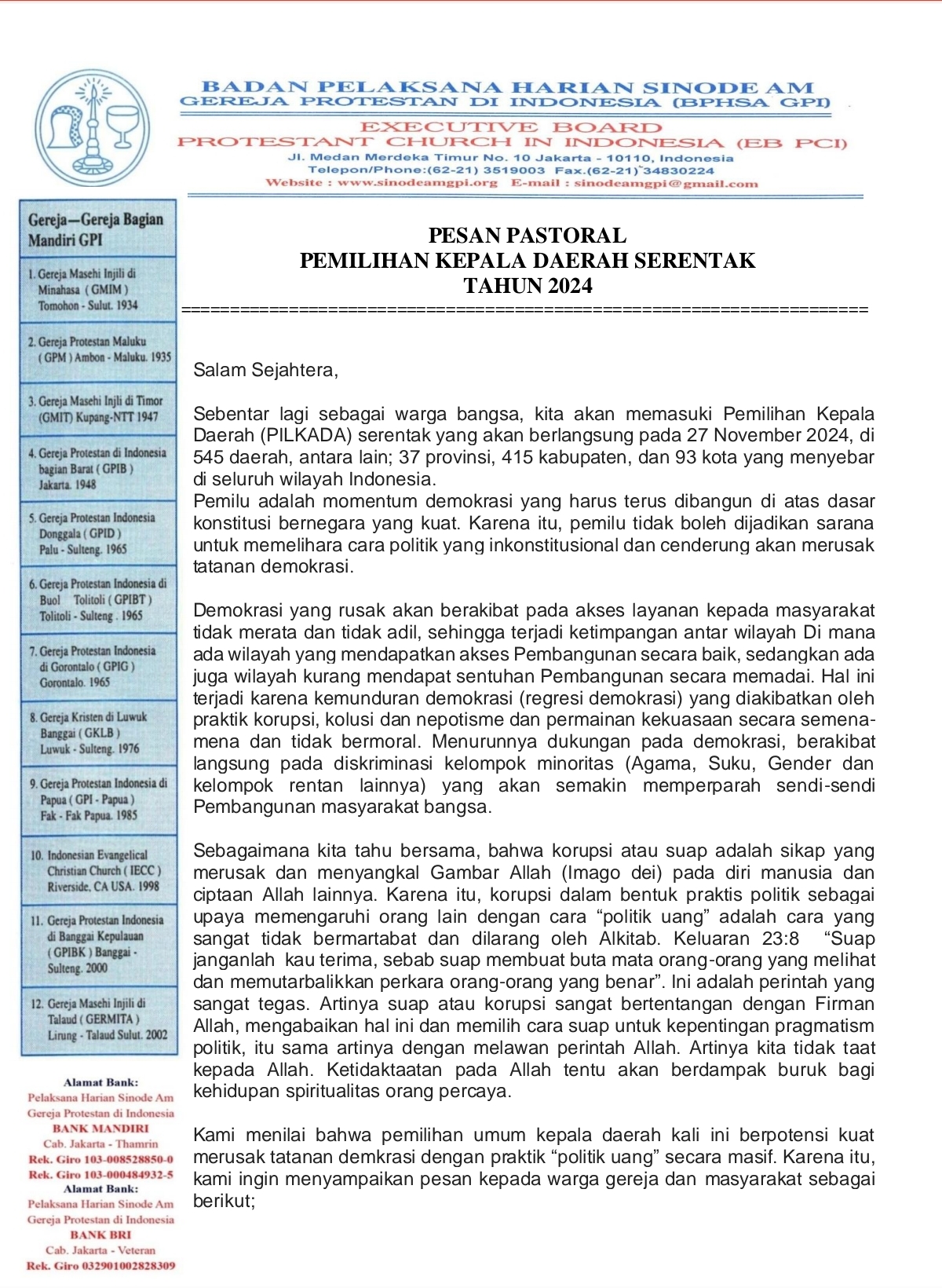 Kami menilai bahwa pemilihan umum kepala daerah kali ini berpotensi kuat merusak tatanan demkrasi dengan praktik “politik uang” secara massif. Karena itu, kami ingin menyampaikan pesan kepada warga gereja dan masyarakat sebagai berikut;