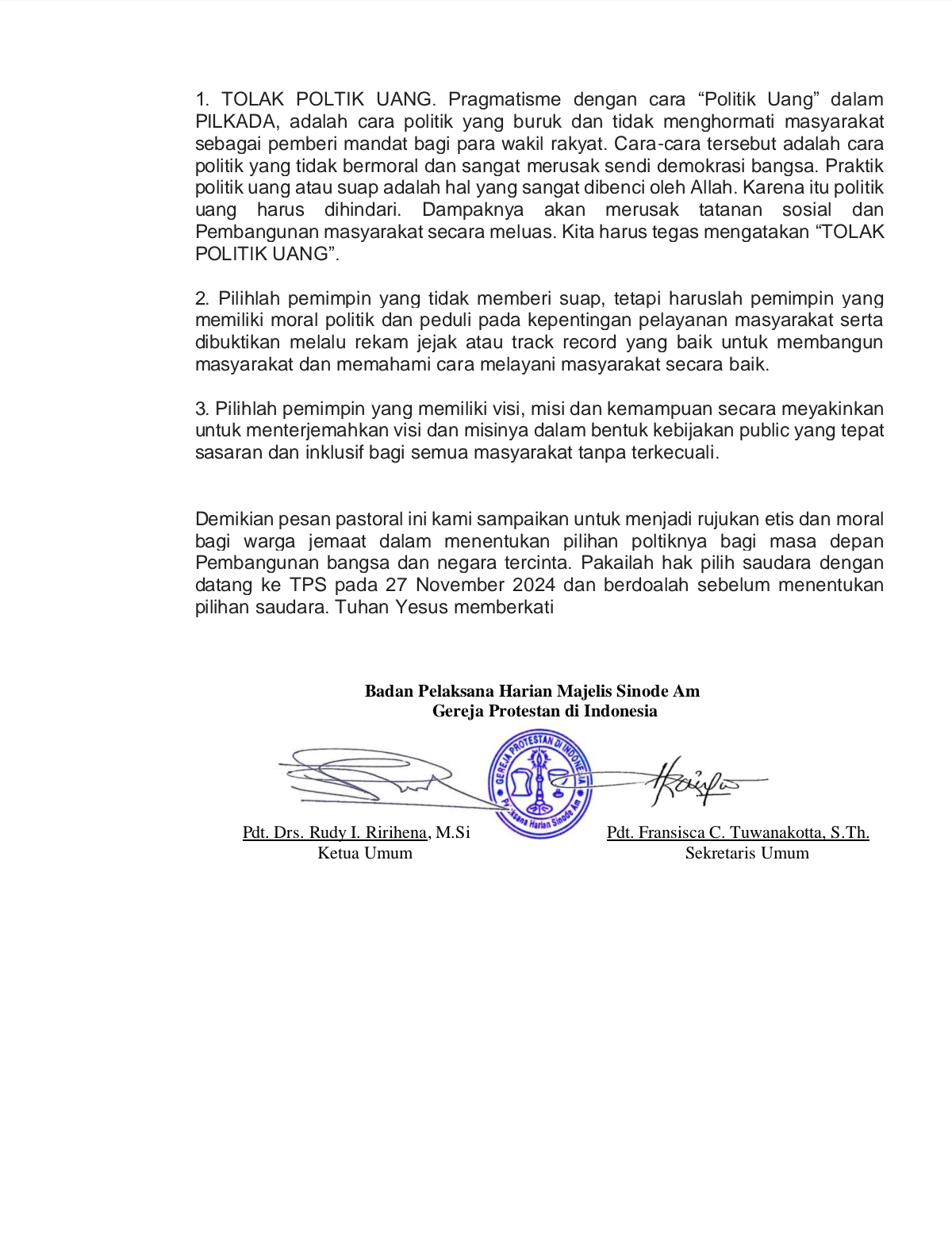 Demikian pesan pastoral ini kami sampaikan untuk menjadi rujukan etis dan moral bagi warga jemaat dalam menentukan pilihan poltiknya bagi masa depan Pembangunan bangsa dan negara tercinta. Pakailah hak pilih saudara dengan datang ke TPS pada 27 November 2024 dan berdoalah sebelum menentukan pilihan saudara. Tuhan Yesus memberkati