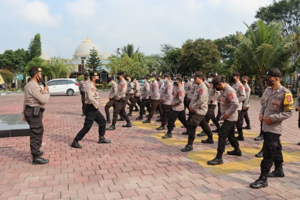 Dalam Pelaksanaan Pelatihan Penanggulangan Unjuk Rasa Anarkis, tetap Mematuhi Protokol Kesehatan, Agar terhindar dari Covid 19″ tutup Kasat Samapta.
