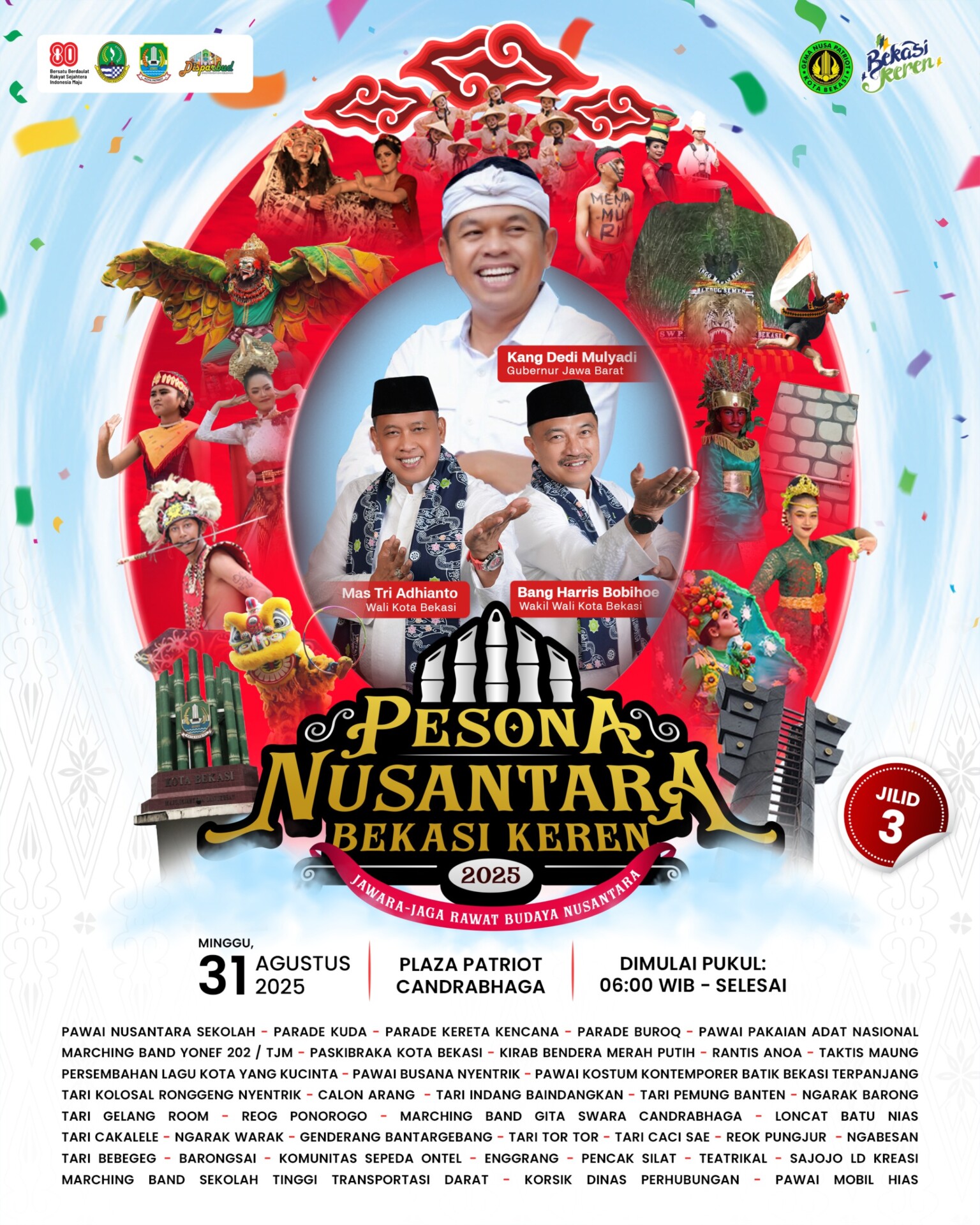 Bekasi,23 Agustus 2015 – Kecamatan Bekasi Timur menggelar Festival Budaya Patriot Jilid 4 dengan semarak dalam rangka merayakan peringatan Kemerdekaan Republik Indonesia yang ke-80 tahun. Acara tersebut dihadiri oleh Wakil Wali Kota Bekasi, Abdul Harris Bobihoe bersama istri Wuri Handayani dan Ketua TP PKK Wiwiek Hargono Tri Adhianto.