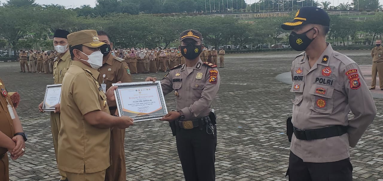 Piagam penghargaan langsung diberikan Bupati H Sukiman kepada Polsek Bonaidarussam sebagai Polsek Terbaik I dengan capaian dosis 1 (80,17 %) Pelaksana Vaksinasi Covid19 Tahun 2021.