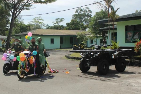 Prajurit Yonif Raider 754 Kostrad melaksanakan Tradisi Pengajuan Nikah, dengan berkeliling satuan Yonif Raider 754 Kostrad sebanyak tujuh kali menggunakan sepeda motor yang sudah dirias dengan sedemikian rupa. Tradisi ini dapat dilaksanakan bagi prajurit yang sudah menyelesaikan berkas pengajuan dan menghadap ke Komandan Yonif Raider 754 beserta ibu, Papua. Sabtu, (26/02/2022).